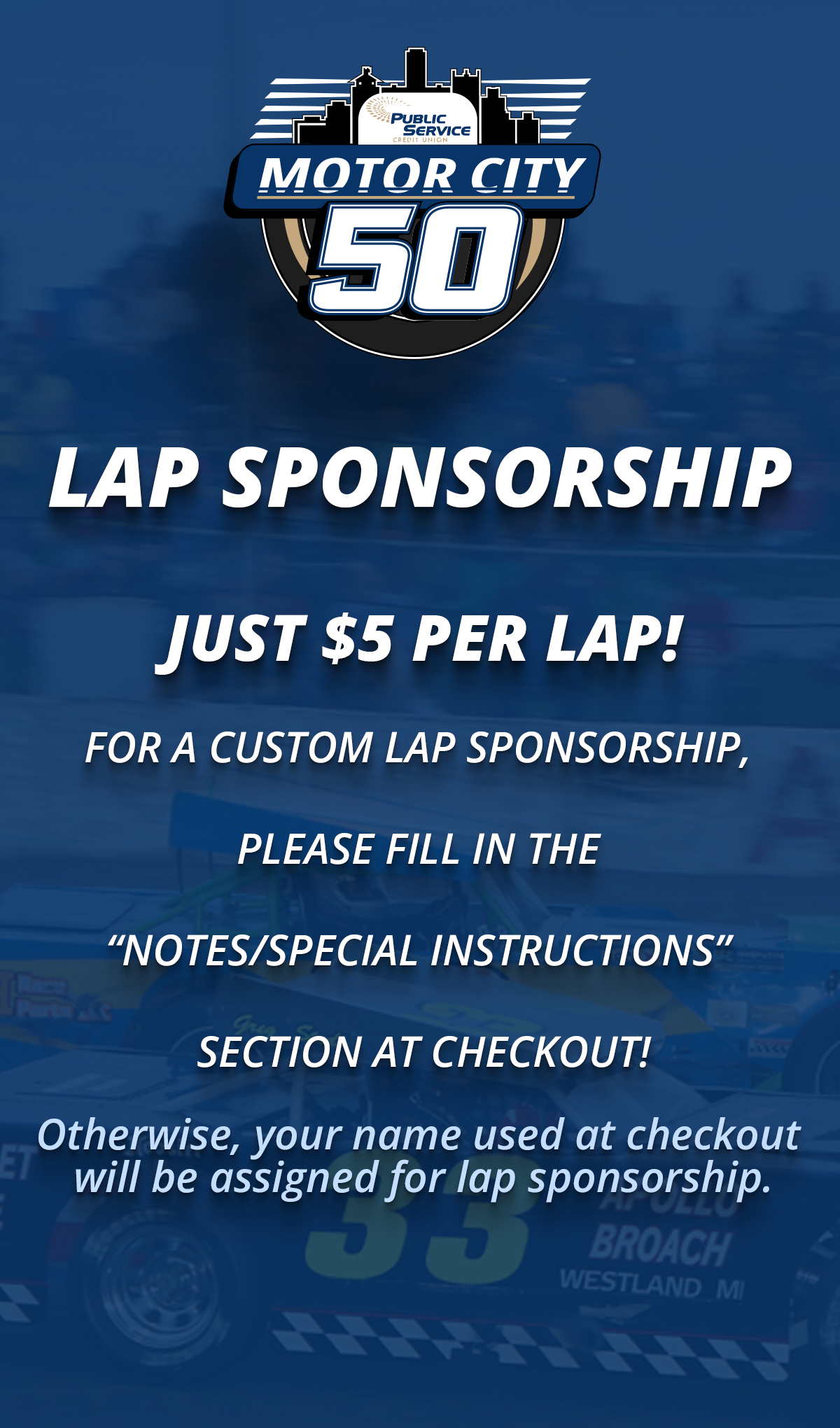 Support the big race at Flat Rock Speedway by naming a lap of the Public Service Credit Union Motor City 50 Figure 8 race at Flat Rock Speedway for just $5! Your sponsorship gets the name or entity of your choice announced as a supporter—fueling the competition and the fun!
