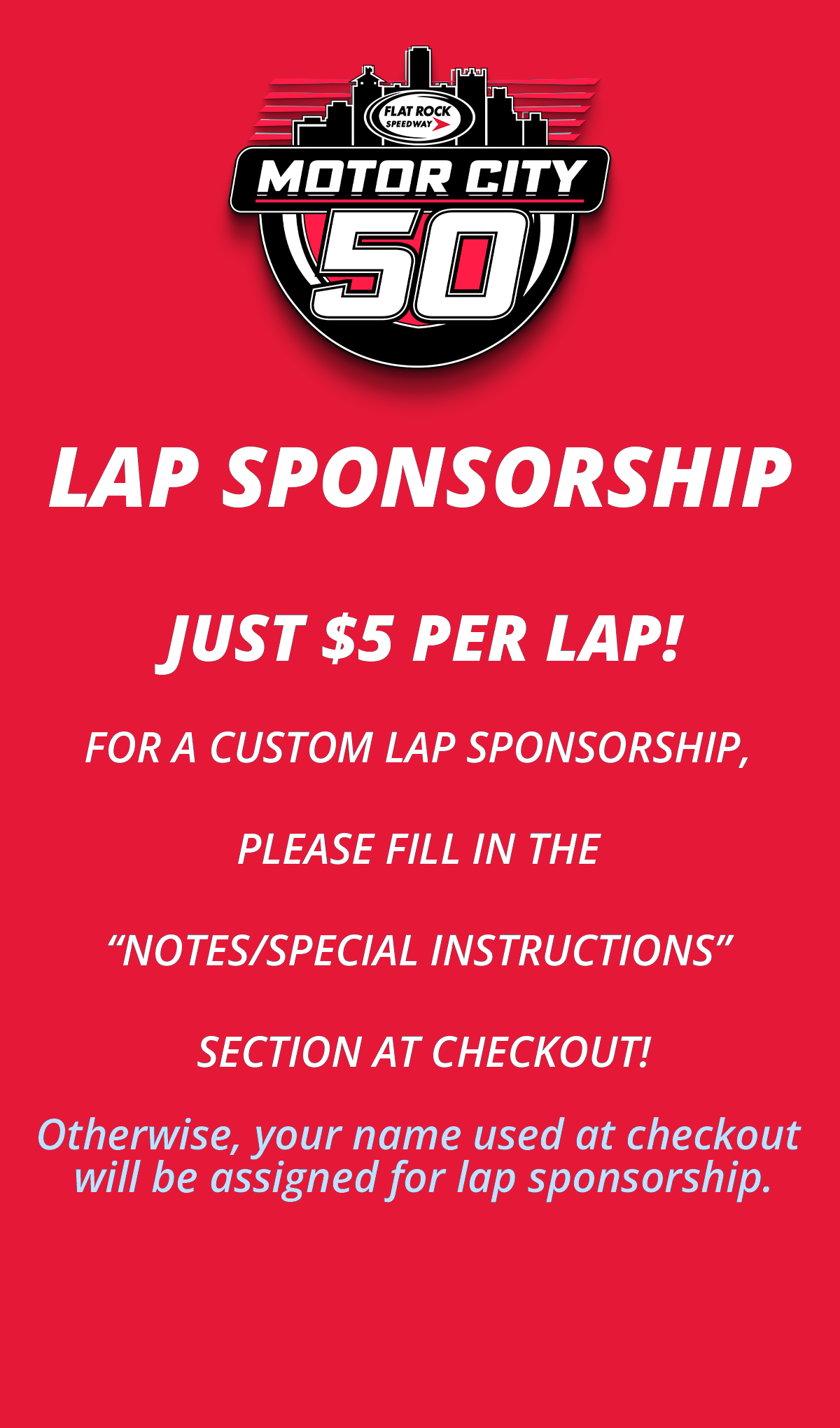 Support the big race at Flat Rock Speedway by naming a lap of the Public Service Credit Union Motor City 50 Figure 8 race at Flat Rock Speedway for just $5! Your sponsorship gets the name or entity of your choice announced as a supporter—fueling the competition and the fun!
