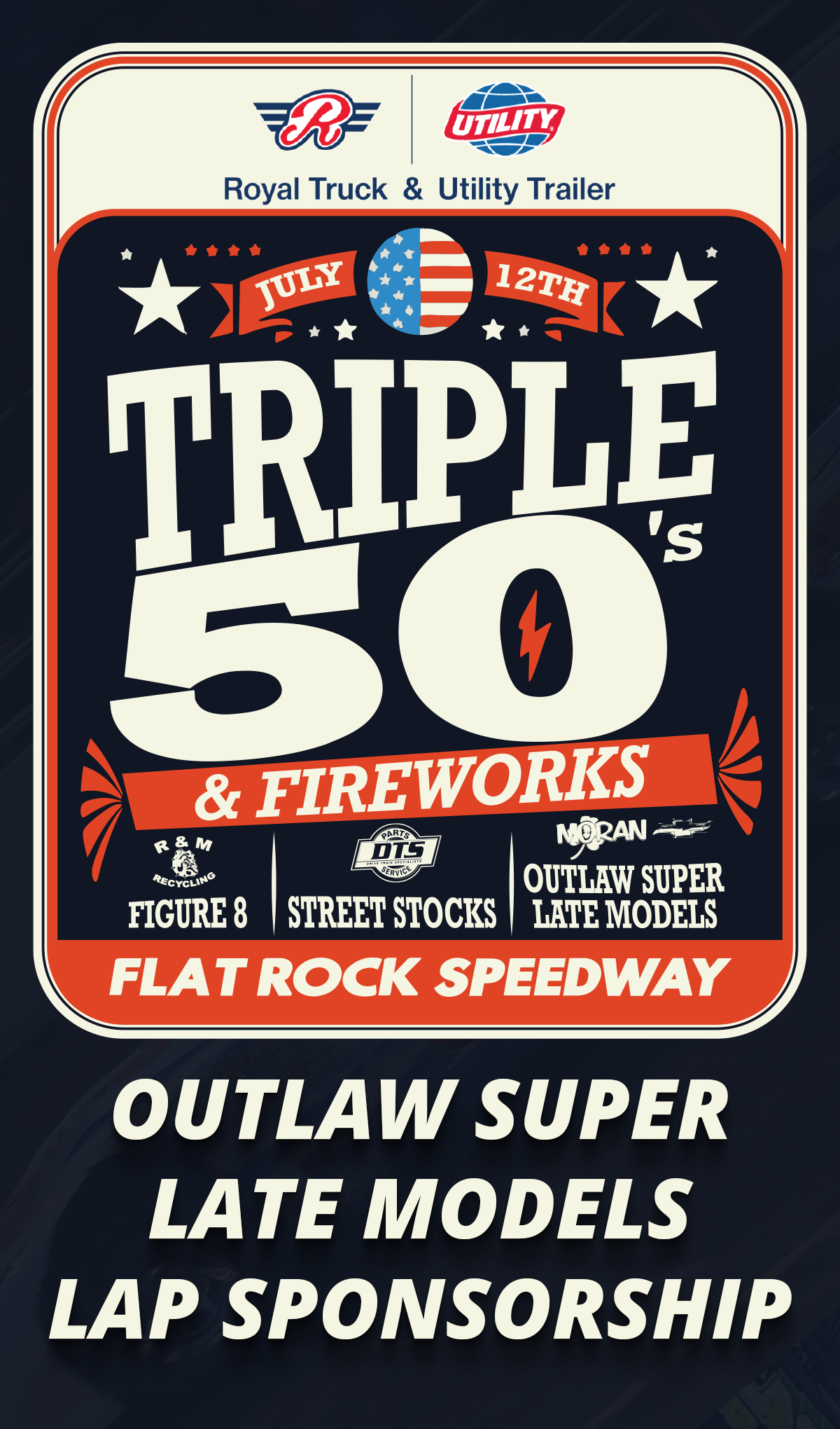 Support the big race at Flat Rock Speedway by naming a lap of the Royal Truck & Utility Trailer Triple 50's Outlaw Super Late Model 50-lap event at Flat Rock Speedway for just $5! Your sponsorship gets the name or entity of your choice announced as a supporter—fueling the competition and the fun!